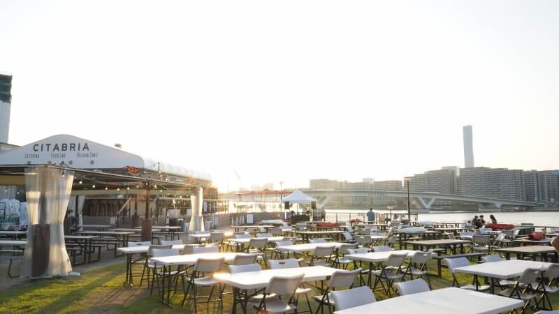 会場内に座席がございます。併設のレストランやキッチンカーでフード&ドリンクも提供していますのでそちらをご利用ください。