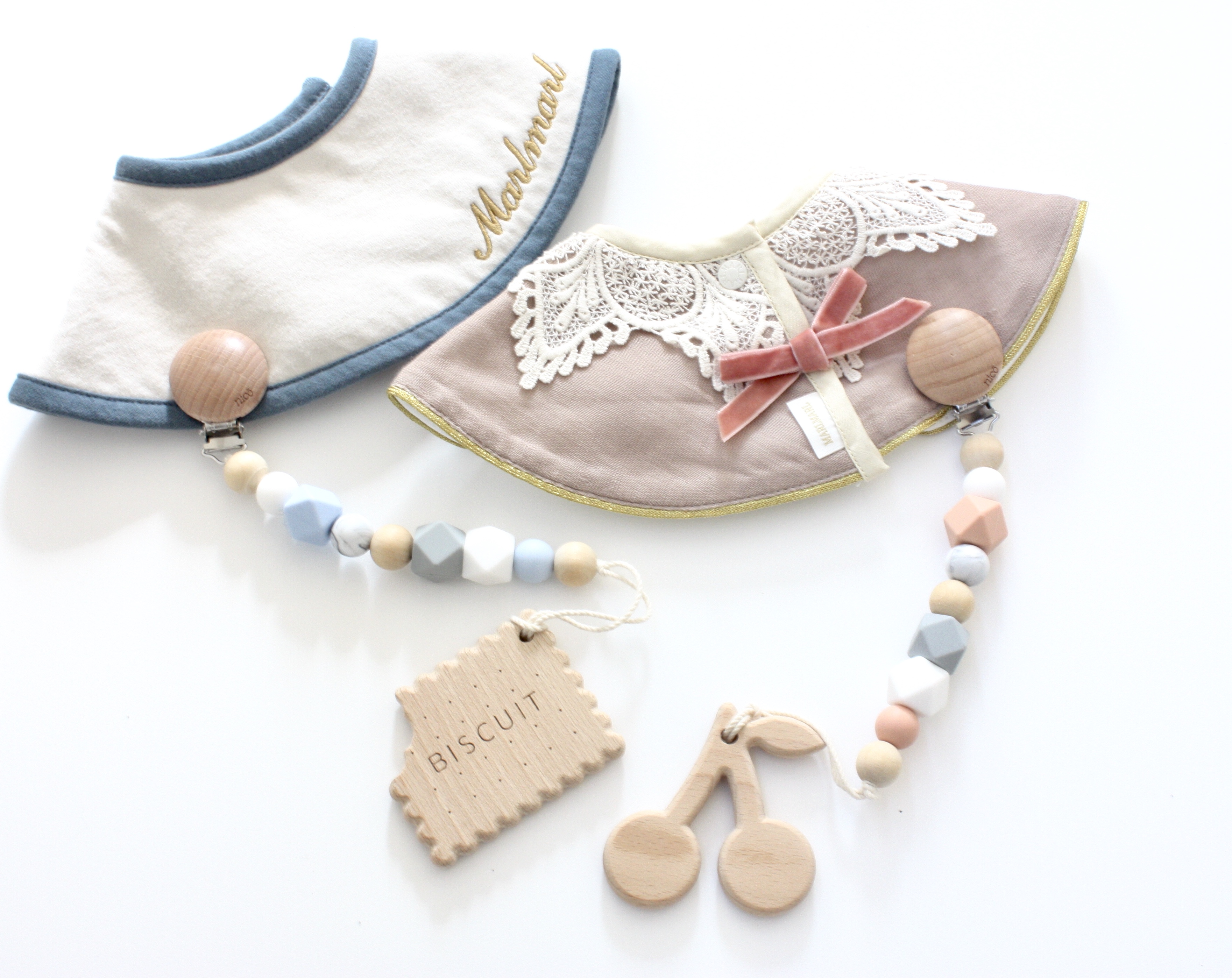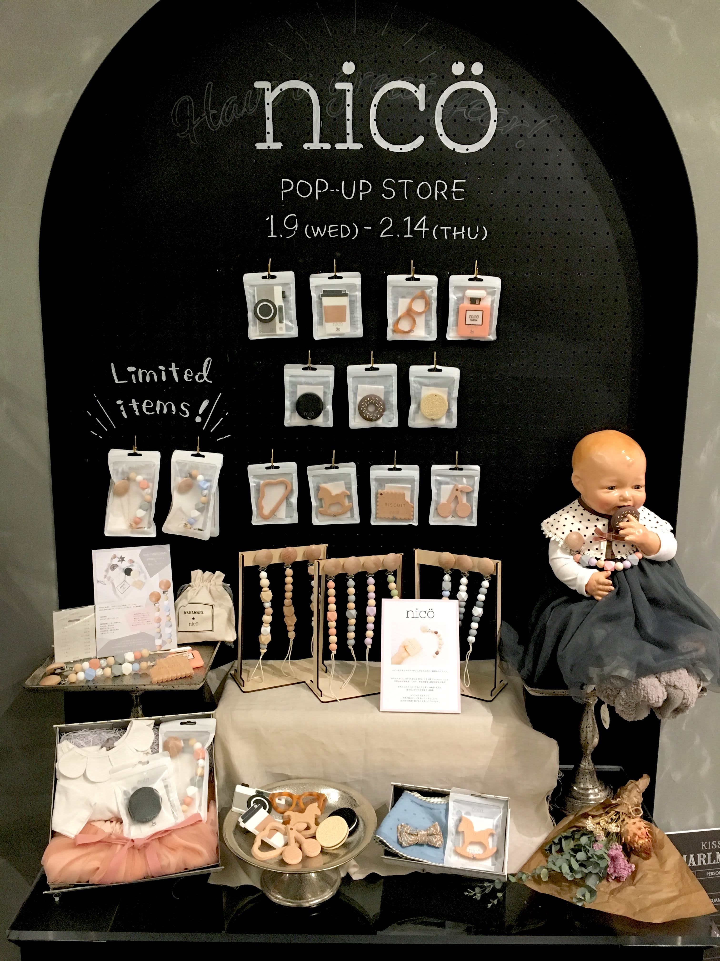今回の期間限定POPUPストアでは「nicö(ニコ)」の通常アイテムに加え、MARLMARL限定デザインのおしゃぶりホルダーを2種類、販売します。