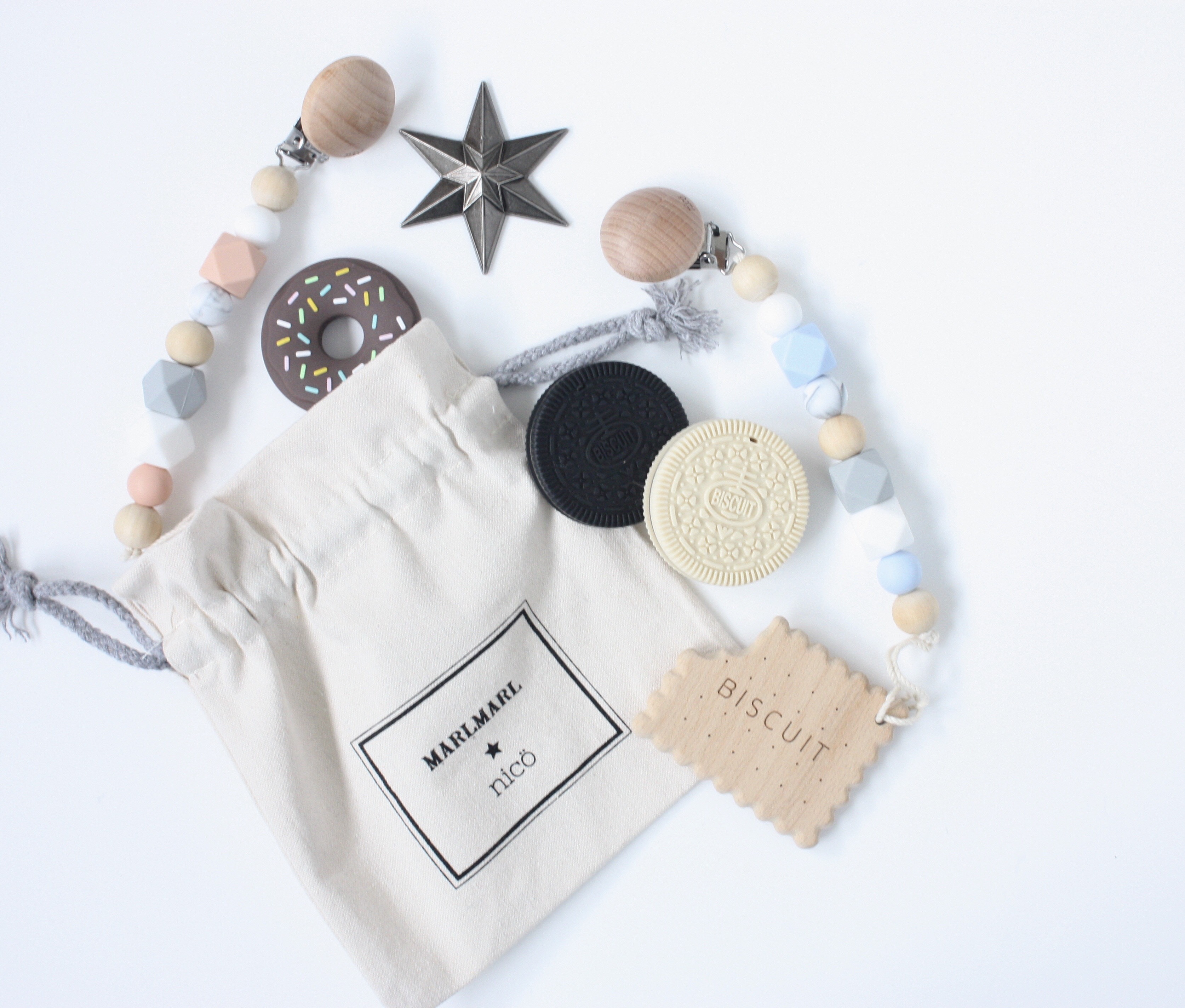 今回の期間限定POPUPストアでは「nicö(ニコ)」の通常アイテムに加え、MARLMARL限定デザインのおしゃぶりホルダーを2種類、販売します。